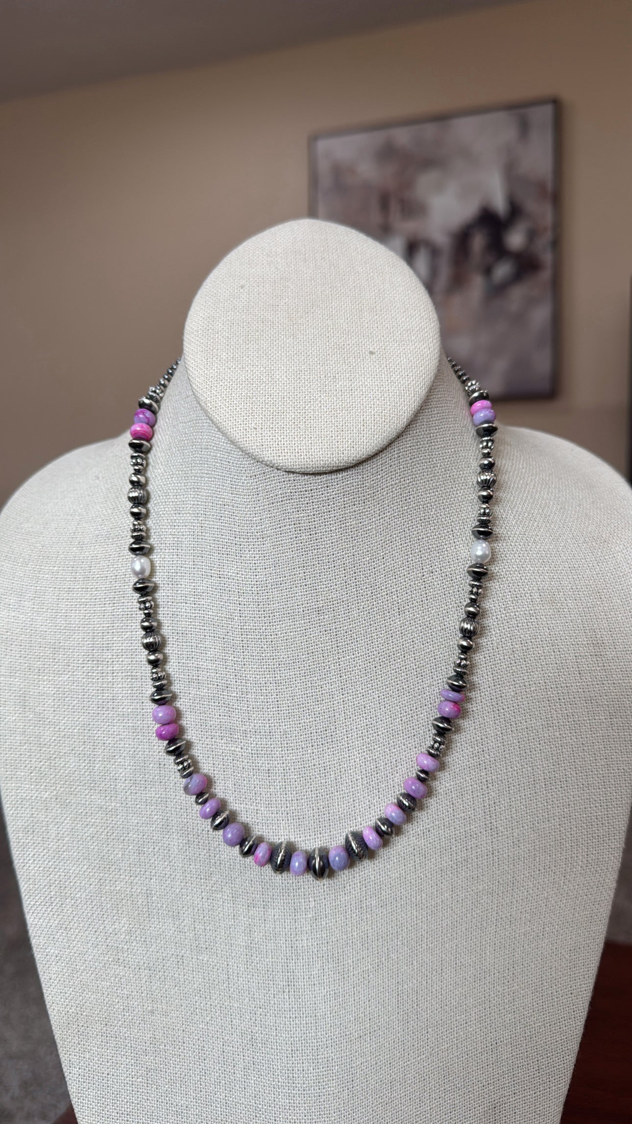 18" Pink & Purple featuring 3-6mm pearls and assorted saucers.